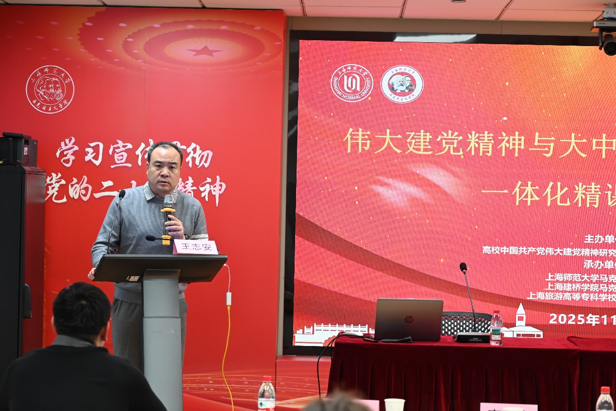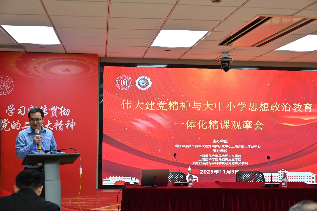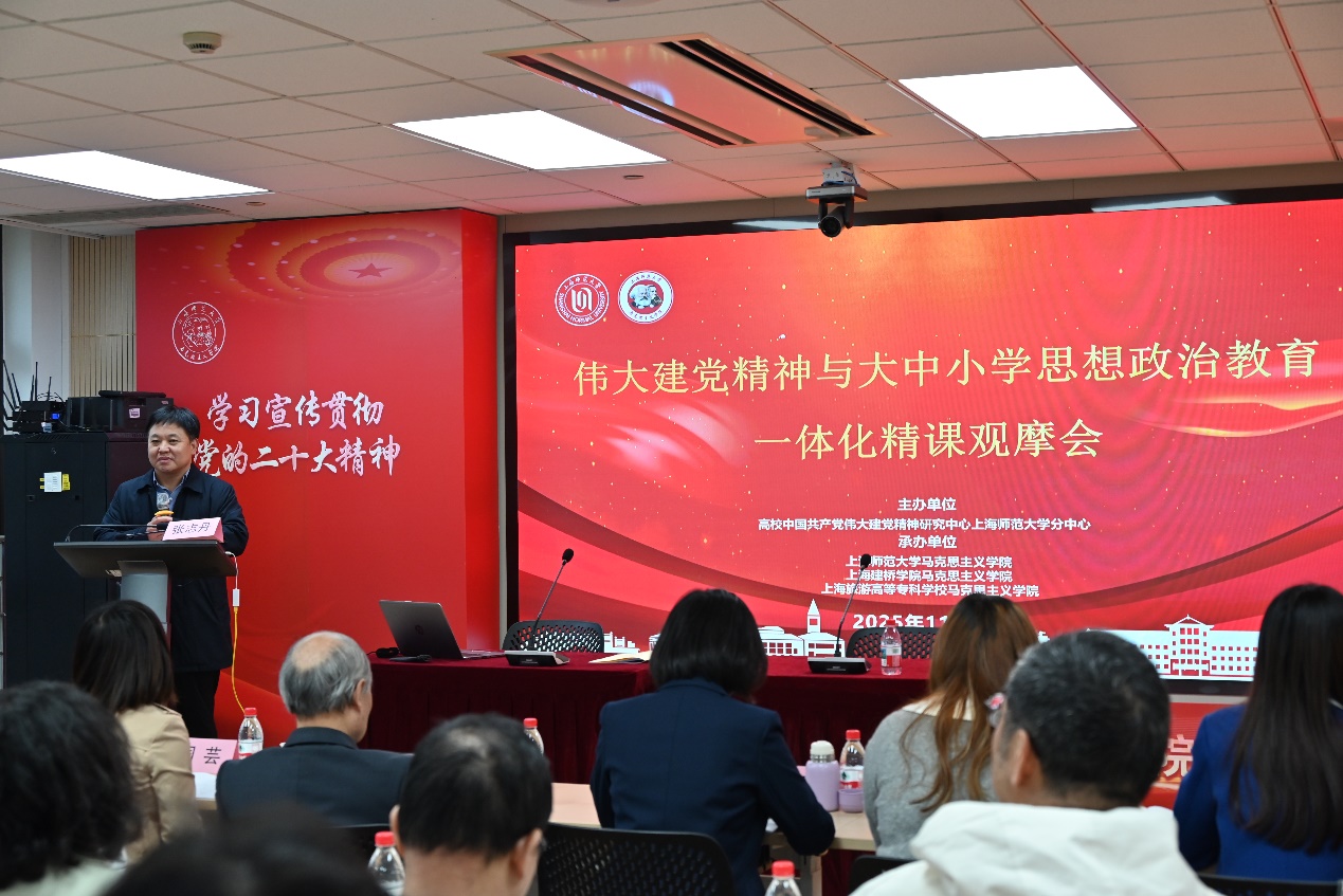为进一步推动中国共产党伟大建党精神与大中小学思想政治教育一体化建设的深度融合,促进各学段思政课程有机衔接与内涵提升,2025年11月9日,高校中国共产党伟大建党精神研究中心上海师范大学分中心主办了“伟大建党精神与大中小学思想政治教育一体化精课观摩会”,本次会议承办单位有上海师范大学马克思主义学院、上海建桥学院马克思主义学院及上海旅游高等专科学校马克思主义学院。