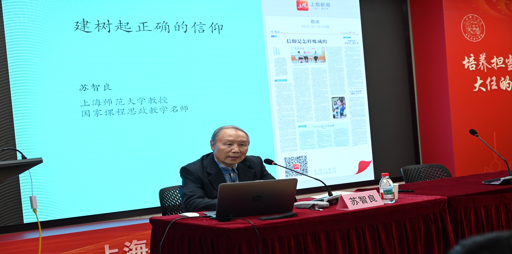 随后开始主旨报告,上海师范大学人文学院教授、上海市文史研究馆馆员、教育部人文社会科学基地上海师范大学都市文化研究中心主任苏智良作题为《建树起正确的信仰》的专题报告。他从理论高度系统阐释了推进大中小学思想政治教育一体化建设的路径,并结合典型案例进行了具象化分析。