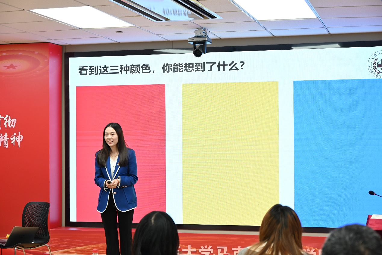 在课程展示环节,会议依序呈现了从小学至大学四个学段的思想政治教育教学片段。上海市教育科学研究院实验小学陈璐老师以《没有共产党就没有新中国》视频为切入点,通过对比城市地标变化,引导学生理解“中国”至“新中国”的历史跨越,并联系中国共产党与少先队的关系,实现伟大建党精神从认知到行动的转化。上海市徐汇区教师教育学院徐敏研究员对陈璐的精课做了详细的点评,指出了优点和不足。