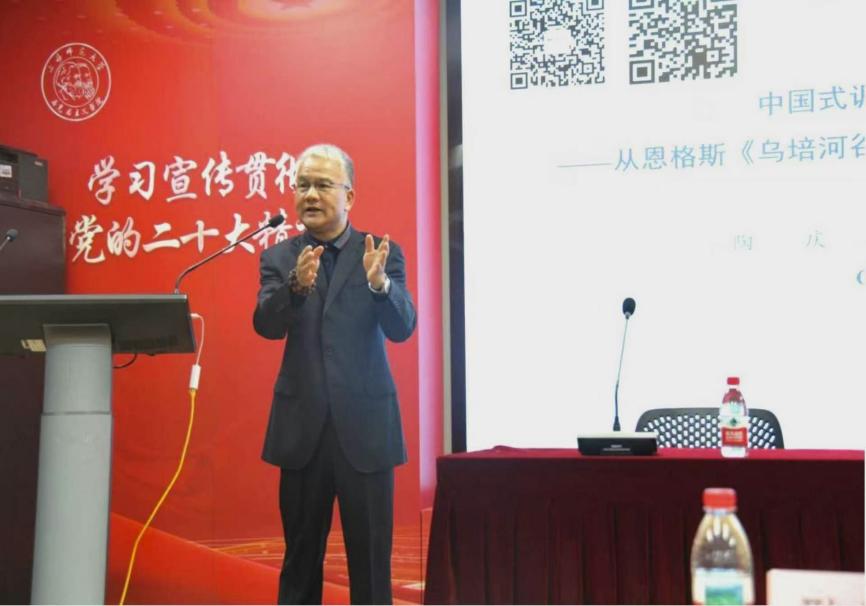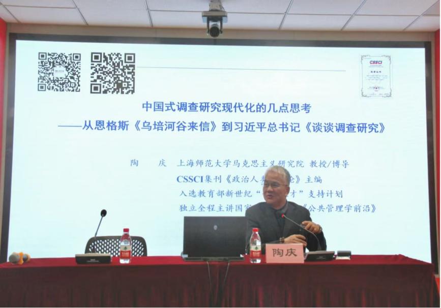 2025年10月30日傍晚6点,上海师范大学马克思主义学院“明德讲坛”系列讲座如期在文科实验楼202室开讲。上海师范大学哲学与法政学院教授、上海师范大学马克思主义理论博士生导师、博士后合作导师陶庆应邀作了题为《中国式调查研究现代化的几点思考——从恩格斯〈乌培河谷来信〉到习近平总书记〈谈谈调查研究〉》的讲座。受上海师范大学马克思主义学院院长张志丹教授委托,此次讲座由程胜荣博士主持,我院2024级与2025级的全体博士研究生和硕士研究生,以及哲学与法政学院部分硕士研究生参加。
